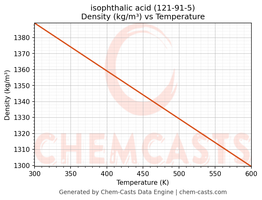 This page presents the temperature-dependent thermodynamic and transport properties of isophthalic acid (CAS 121-91-5) calculated at a constant pressure of 1 atm (101325 Pa) over the temperature range 250-500 K.