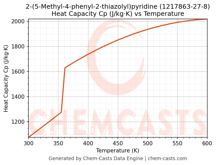 - Specific heat capacity (Cp) indicates the amount of energy required to raise the temperature of 2-(5-Methyl-4-phenyl-2-thiazolyl)pyridine and is critical for energy balance and heat-exchanger design.