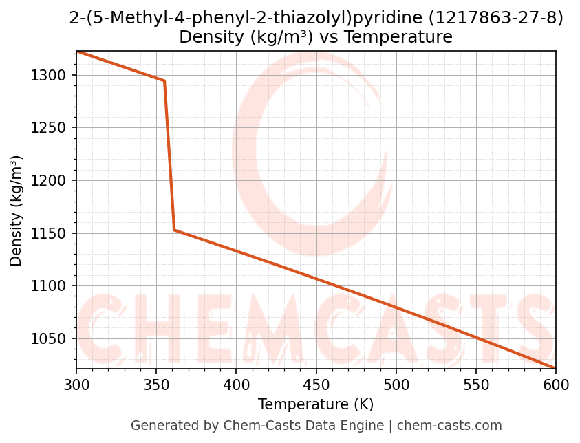 This page presents the temperature-dependent thermodynamic and transport properties of 2-(5-Methyl-4-phenyl-2-thiazolyl)pyridine (CAS 1217863-27-8) calculated at a constant pressure of 1 atm (101325 Pa) over the temperature range 250-500 K.