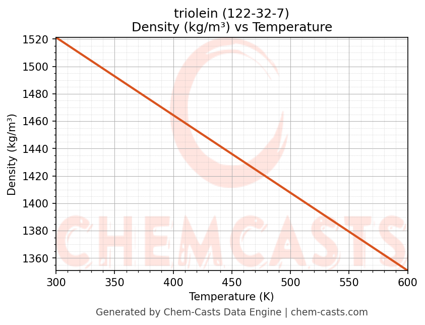 This page presents the temperature-dependent thermodynamic and transport properties of triolein (CAS 122-32-7) calculated at a constant pressure of 1 atm (101325 Pa) over the temperature range 250-500 K.