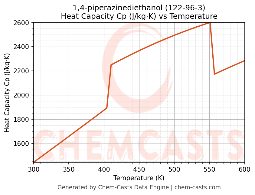 - Specific heat capacity (Cp) indicates the amount of energy required to raise the temperature of 1,4-piperazinediethanol and is critical for energy balance and heat-exchanger design.