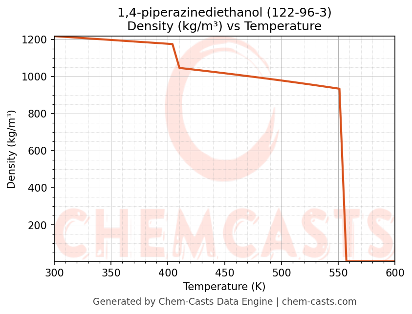 This page presents the temperature-dependent thermodynamic and transport properties of 1,4-piperazinediethanol (CAS 122-96-3) calculated at a constant pressure of 1 atm (101325 Pa) over the temperature range 250-500 K.