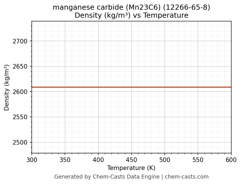 This page presents the temperature-dependent thermodynamic and transport properties of manganese carbide (Mn23C6) (CAS 12266-65-8) calculated at a constant pressure of 1 atm (101325 Pa) over the temperature range 250-500 K.