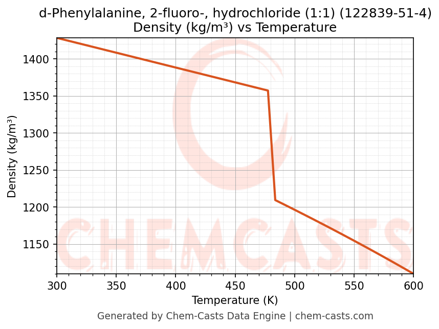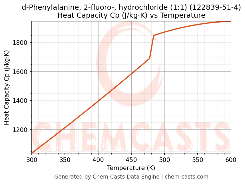 This page presents the temperature-dependent thermodynamic and transport properties of d-Phenylalanine, 2-fluoro-, hydrochloride (1:1) (CAS 122839-51-4) calculated at a constant pressure of 1 atm (101325 Pa) over the temperature range 250-500 K.