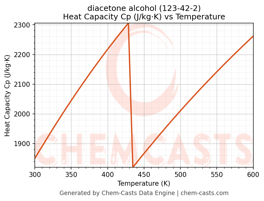 - Specific heat capacity (Cp) indicates the amount of energy required to raise the temperature of diacetone alcohol and is critical for energy balance and heat-exchanger design.