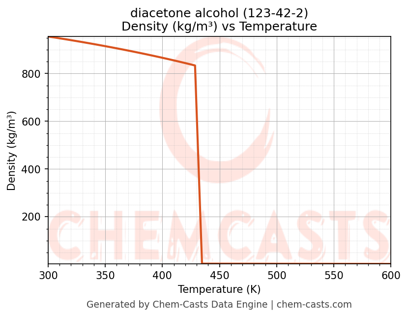 This page presents the temperature-dependent thermodynamic and transport properties of diacetone alcohol (CAS 123-42-2) calculated at a constant pressure of 1 atm (101325 Pa) over the temperature range 250-500 K.