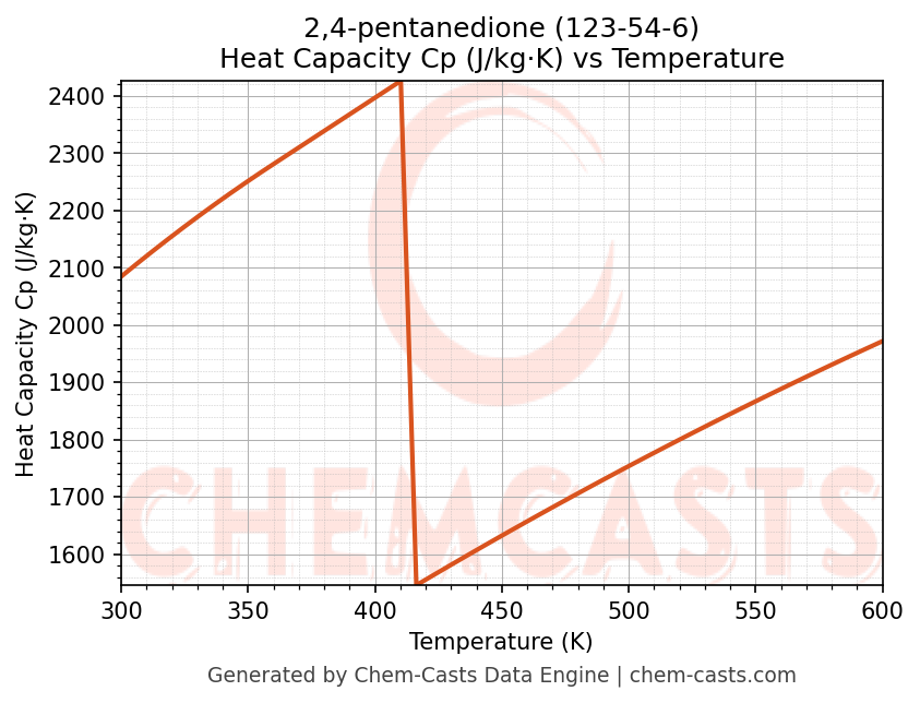 - Specific heat capacity (Cp) indicates the amount of energy required to raise the temperature of 2,4-pentanedione and is critical for energy balance and heat-exchanger design.