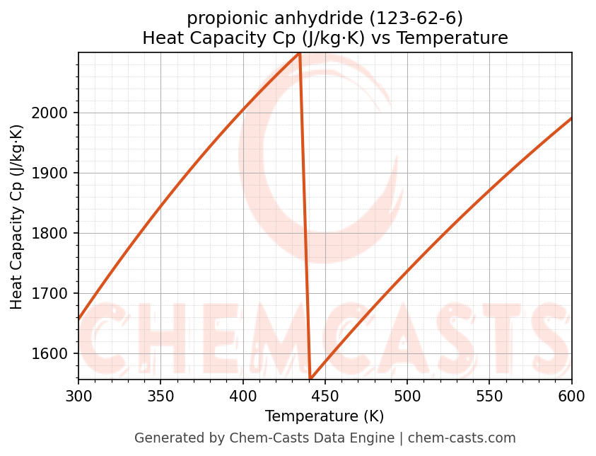 - Specific heat capacity (Cp) indicates the amount of energy required to raise the temperature of propionic anhydride and is critical for energy balance and heat-exchanger design.