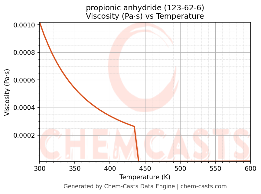 This page presents the temperature-dependent thermodynamic and transport properties of propionic anhydride (CAS 123-62-6) calculated at a constant pressure of 1 atm (101325 Pa) over the temperature range 250-500 K.