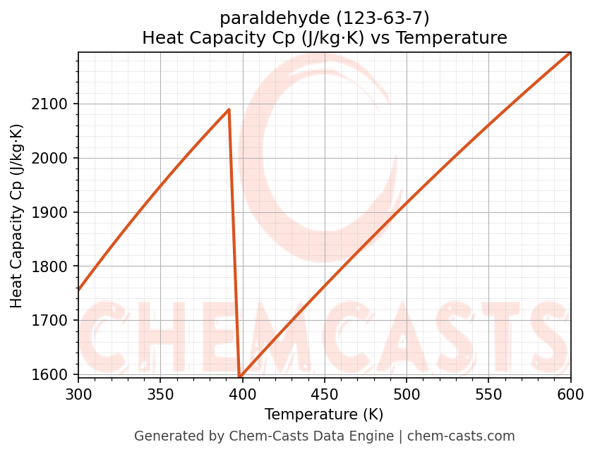 - Specific heat capacity (Cp) indicates the amount of energy required to raise the temperature of paraldehyde and is critical for energy balance and heat-exchanger design.