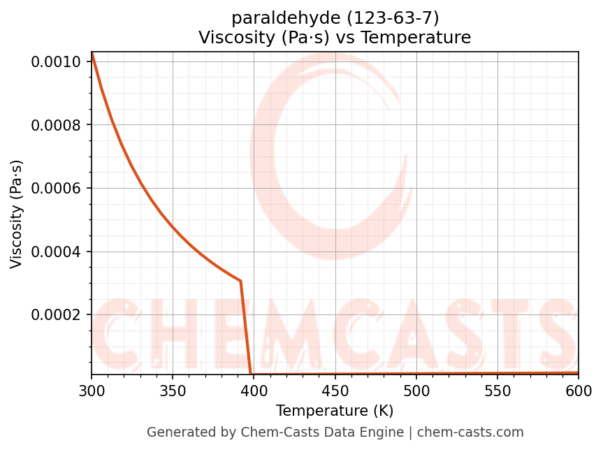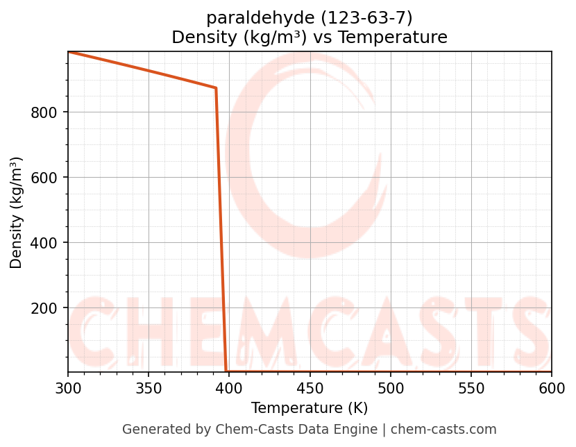 This page presents the temperature-dependent thermodynamic and transport properties of paraldehyde (CAS 123-63-7) calculated at a constant pressure of 1 atm (101325 Pa) over the temperature range 250-500 K.