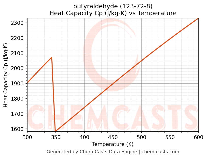 - Specific heat capacity (Cp) indicates the amount of energy required to raise the temperature of butyraldehyde and is critical for energy balance and heat-exchanger design.