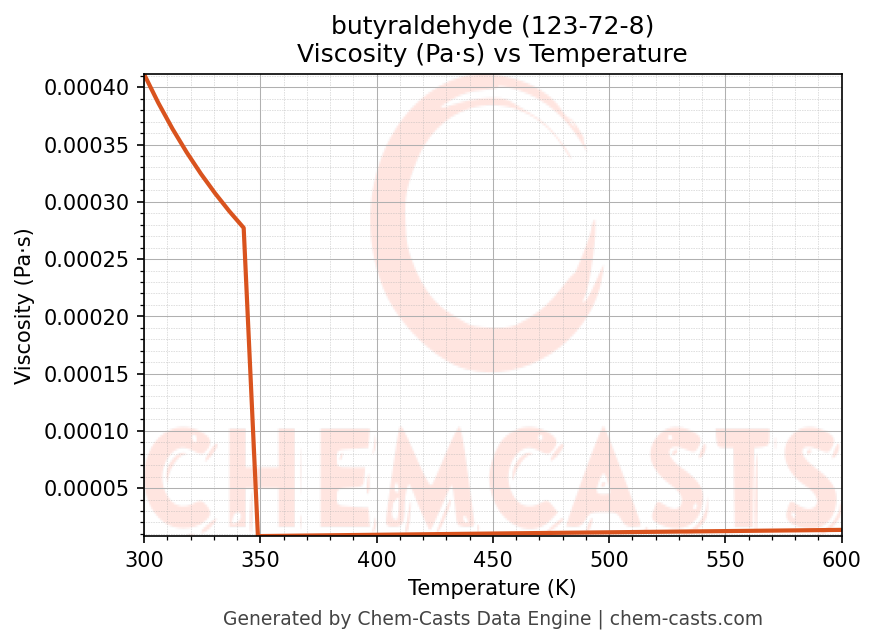 This page presents the temperature-dependent thermodynamic and transport properties of butyraldehyde (CAS 123-72-8) calculated at a constant pressure of 1 atm (101325 Pa) over the temperature range 250-500 K.