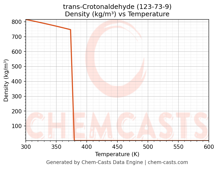 This page presents the temperature-dependent thermodynamic and transport properties of trans-Crotonaldehyde (CAS 123-73-9) calculated at a constant pressure of 1 atm (101325 Pa) over the temperature range 250-500 K.