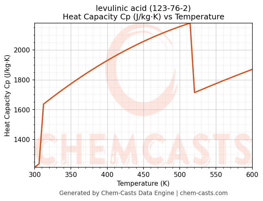 - Specific heat capacity (Cp) indicates the amount of energy required to raise the temperature of levulinic acid and is critical for energy balance and heat-exchanger design.