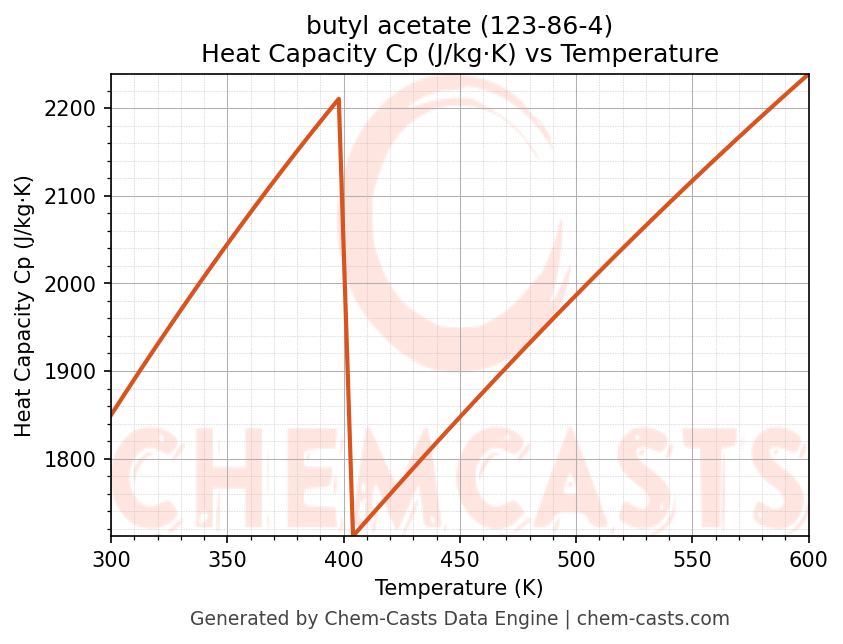 - Specific heat capacity (Cp) indicates the amount of energy required to raise the temperature of butyl acetate and is critical for energy balance and heat-exchanger design.