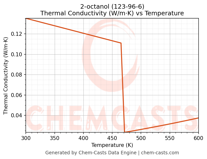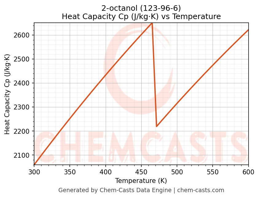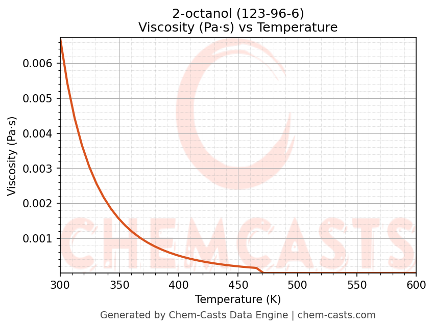 This page presents the temperature-dependent thermodynamic and transport properties of 2-octanol (CAS 123-96-6) calculated at a constant pressure of 1 atm (101325 Pa) over the temperature range 250-500 K.