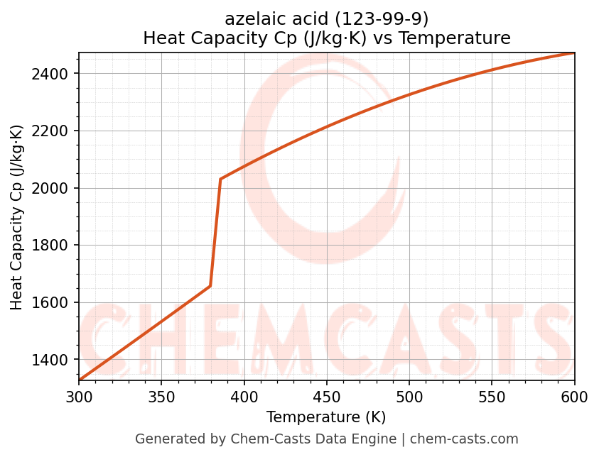 - Specific heat capacity (Cp) indicates the amount of energy required to raise the temperature of azelaic acid and is critical for energy balance and heat-exchanger design.