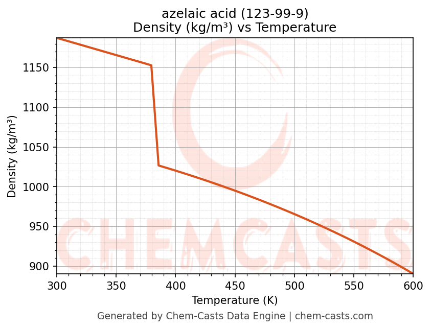 This page presents the temperature-dependent thermodynamic and transport properties of azelaic acid (CAS 123-99-9) calculated at a constant pressure of 1 atm (101325 Pa) over the temperature range 250-500 K.