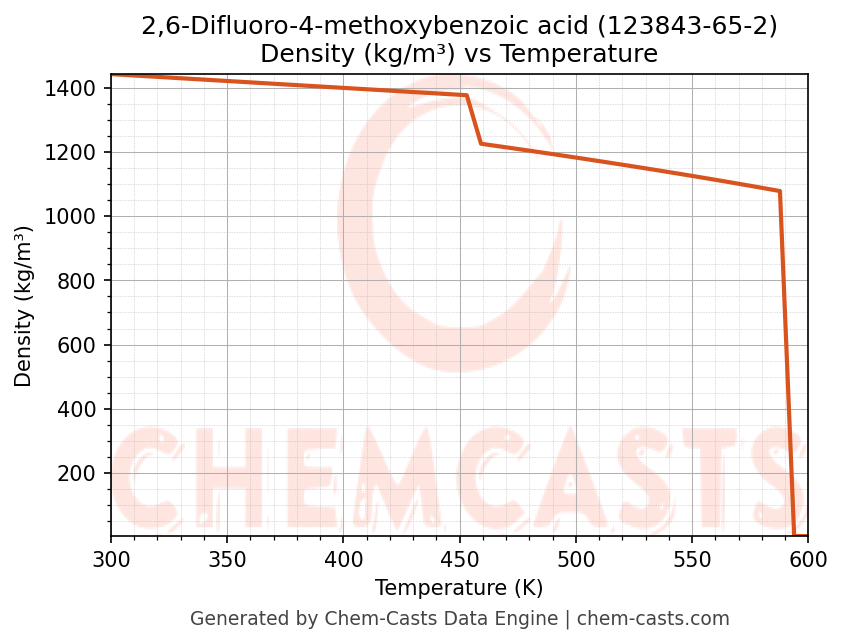 This page presents the temperature-dependent thermodynamic and transport properties of 2,6-Difluoro-4-methoxybenzoic acid (CAS 123843-65-2) calculated at a constant pressure of 1 atm (101325 Pa) over the temperature range 250-500 K.