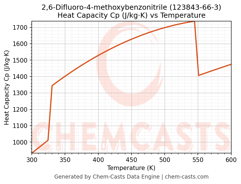 - Specific heat capacity (Cp) indicates the amount of energy required to raise the temperature of 2,6-Difluoro-4-methoxybenzonitrile and is critical for energy balance and heat-exchanger design.