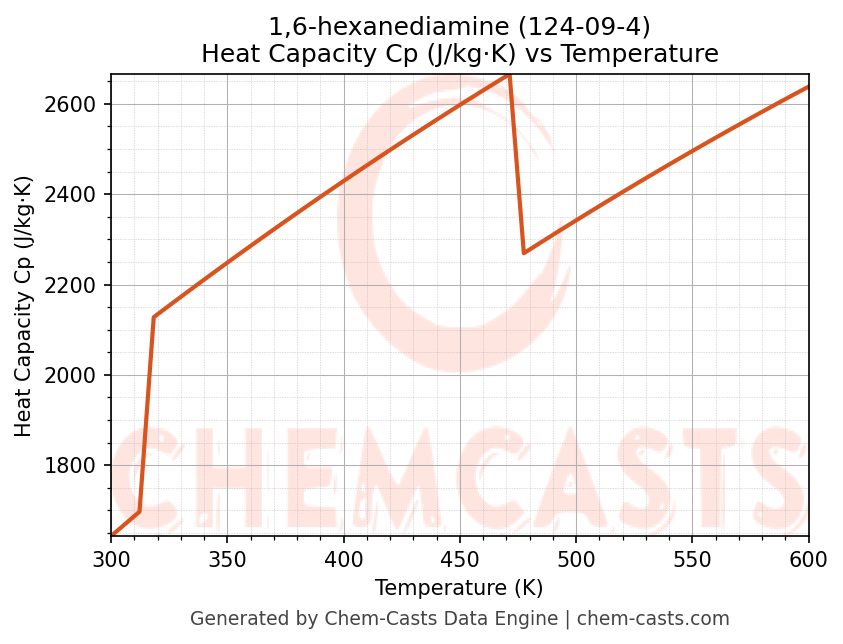- Specific heat capacity (Cp) indicates the amount of energy required to raise the temperature of 1,6-hexanediamine and is critical for energy balance and heat-exchanger design.