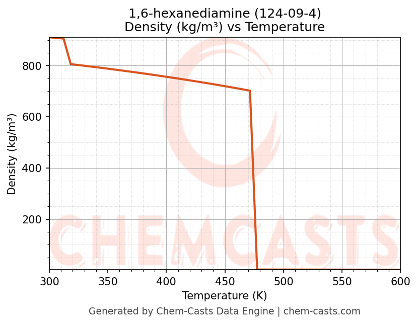 This page presents the temperature-dependent thermodynamic and transport properties of 1,6-hexanediamine (CAS 124-09-4) calculated at a constant pressure of 1 atm (101325 Pa) over the temperature range 250-500 K.