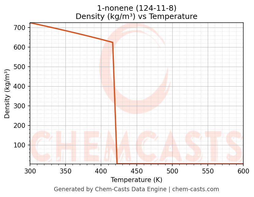 - Specific heat capacity (Cp) indicates the amount of energy required to raise the temperature of 1-nonene and is critical for energy balance and heat-exchanger design.