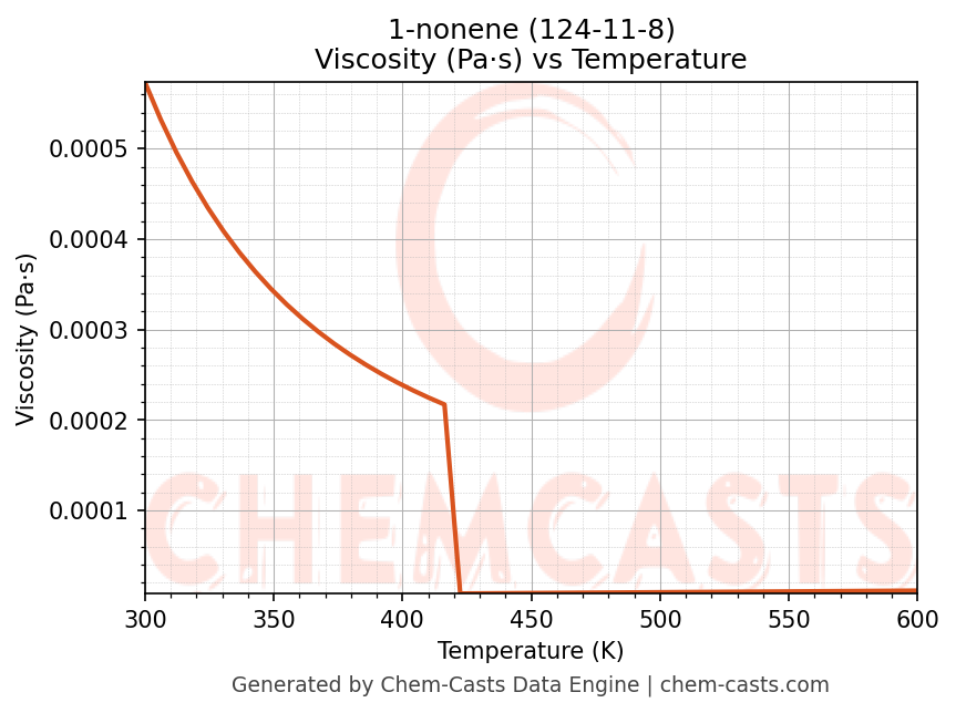This page presents the temperature-dependent thermodynamic and transport properties of 1-nonene (CAS 124-11-8) calculated at a constant pressure of 1 atm (101325 Pa) over the temperature range 250-500 K.