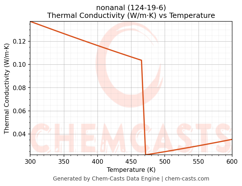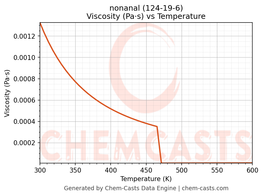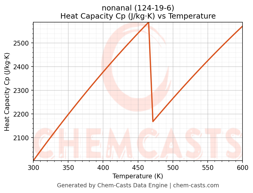 This page presents the temperature-dependent thermodynamic and transport properties of nonanal (CAS 124-19-6) calculated at a constant pressure of 1 atm (101325 Pa) over the temperature range 250-500 K.