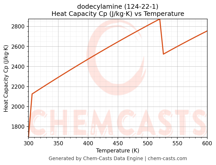 - Specific heat capacity (Cp) indicates the amount of energy required to raise the temperature of dodecylamine and is critical for energy balance and heat-exchanger design.