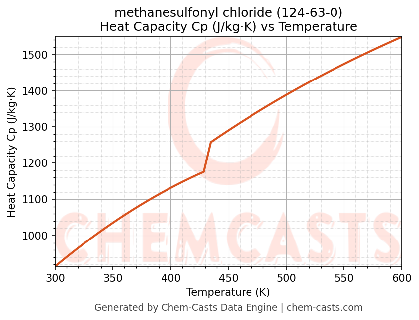 - Specific heat capacity (Cp) indicates the amount of energy required to raise the temperature of methanesulfonyl chloride and is critical for energy balance and heat-exchanger design.