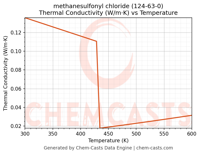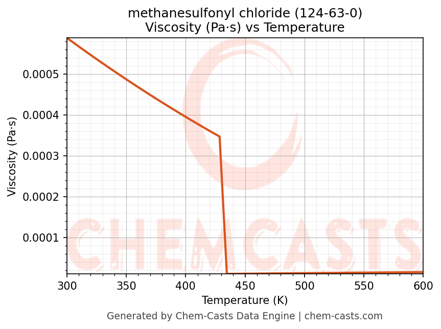 This page presents the temperature-dependent thermodynamic and transport properties of methanesulfonyl chloride (CAS 124-63-0) calculated at a constant pressure of 1 atm (101325 Pa) over the temperature range 250-500 K.