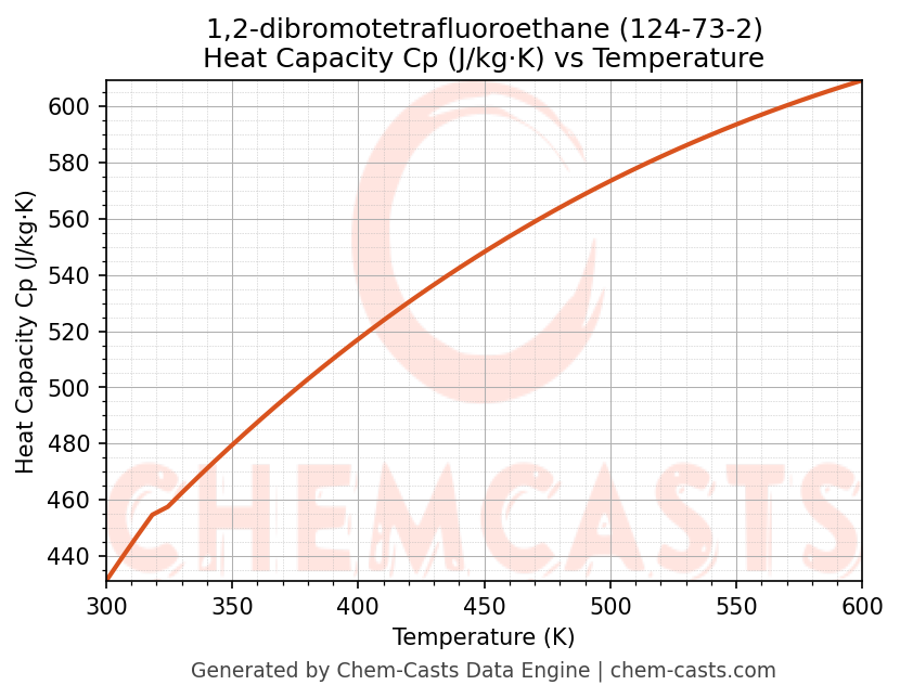 - Specific heat capacity (Cp) indicates the amount of energy required to raise the temperature of 1,2-dibromotetrafluoroethane and is critical for energy balance and heat-exchanger design.