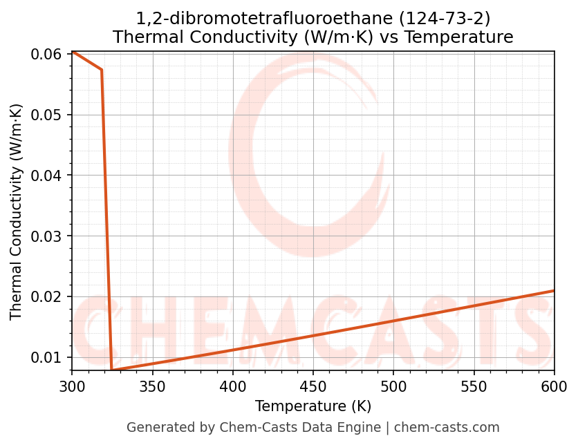 This page presents the temperature-dependent thermodynamic and transport properties of 1,2-dibromotetrafluoroethane (CAS 124-73-2) calculated at a constant pressure of 1 atm (101325 Pa) over the temperature range 250-500 K.