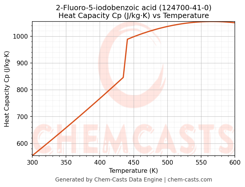 - Specific heat capacity (Cp) indicates the amount of energy required to raise the temperature of 2-Fluoro-5-iodobenzoic acid and is critical for energy balance and heat-exchanger design.