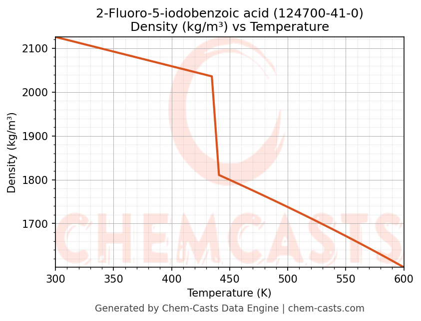 This page presents the temperature-dependent thermodynamic and transport properties of 2-Fluoro-5-iodobenzoic acid (CAS 124700-41-0) calculated at a constant pressure of 1 atm (101325 Pa) over the temperature range 250-500 K.