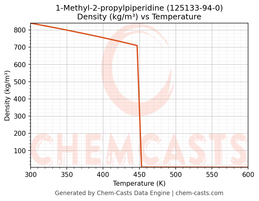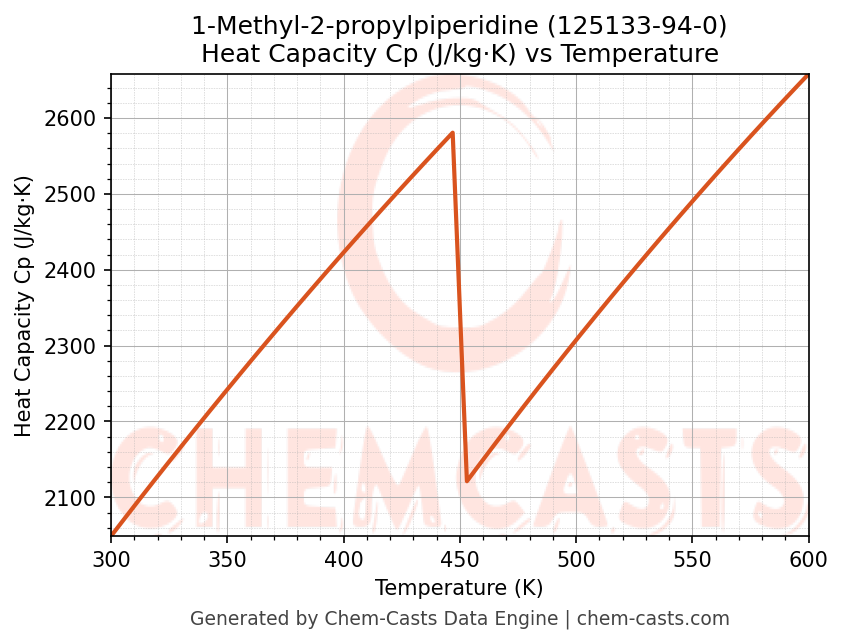 This page presents the temperature-dependent thermodynamic and transport properties of 1-Methyl-2-propylpiperidine (CAS 125133-94-0) calculated at a constant pressure of 1 atm (101325 Pa) over the temperature range 250-500 K.