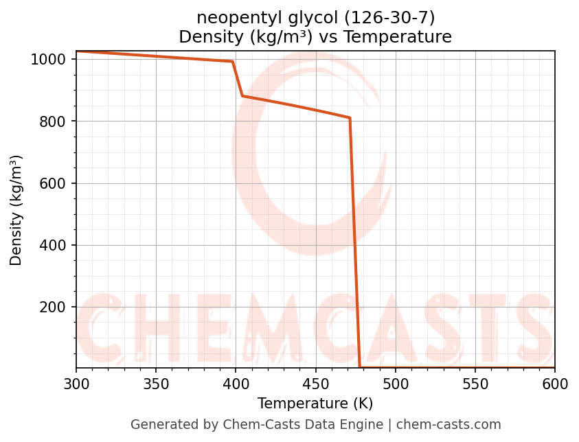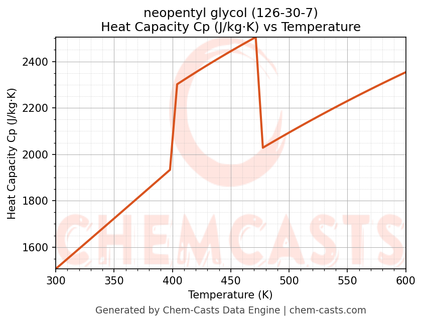 This page presents the temperature-dependent thermodynamic and transport properties of neopentyl glycol (CAS 126-30-7) calculated at a constant pressure of 1 atm (101325 Pa) over the temperature range 250-500 K.