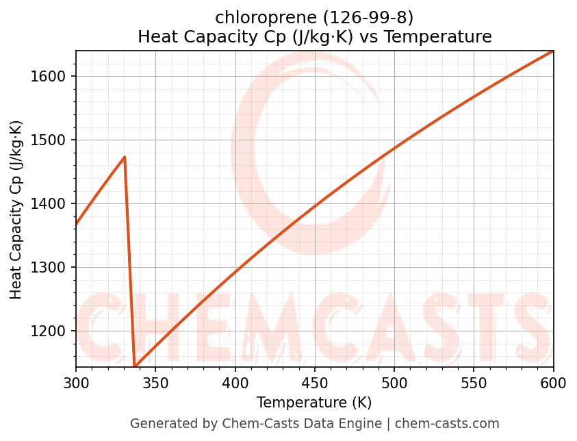- Specific heat capacity (Cp) indicates the amount of energy required to raise the temperature of chloroprene and is critical for energy balance and heat-exchanger design.