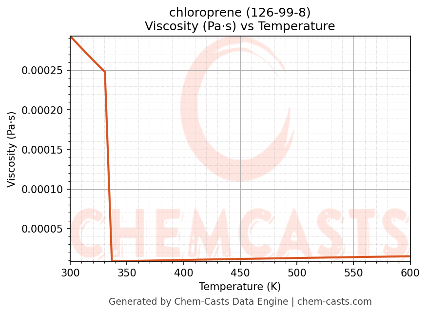 This page presents the temperature-dependent thermodynamic and transport properties of chloroprene (CAS 126-99-8) calculated at a constant pressure of 1 atm (101325 Pa) over the temperature range 250-500 K.