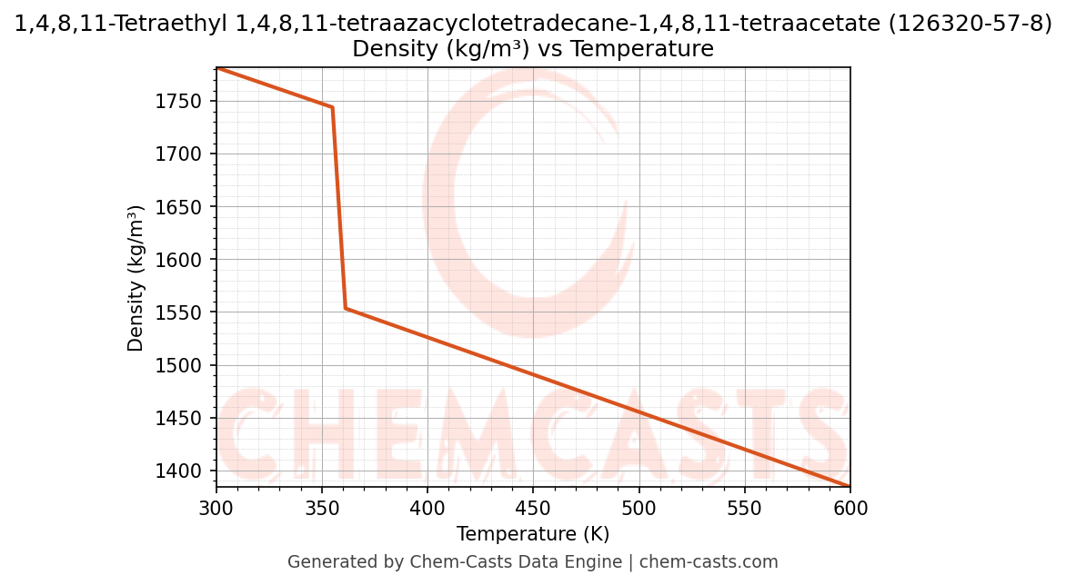 This page presents the temperature-dependent thermodynamic and transport properties of 1,4,8,11-Tetraethyl 1,4,8,11-tetraazacyclotetradecane-1,4,8,11-tetraacetate (CAS 126320-57-8) calculated at a constant pressure of 1 atm (101325 Pa) over the temperature range 250-500 K.