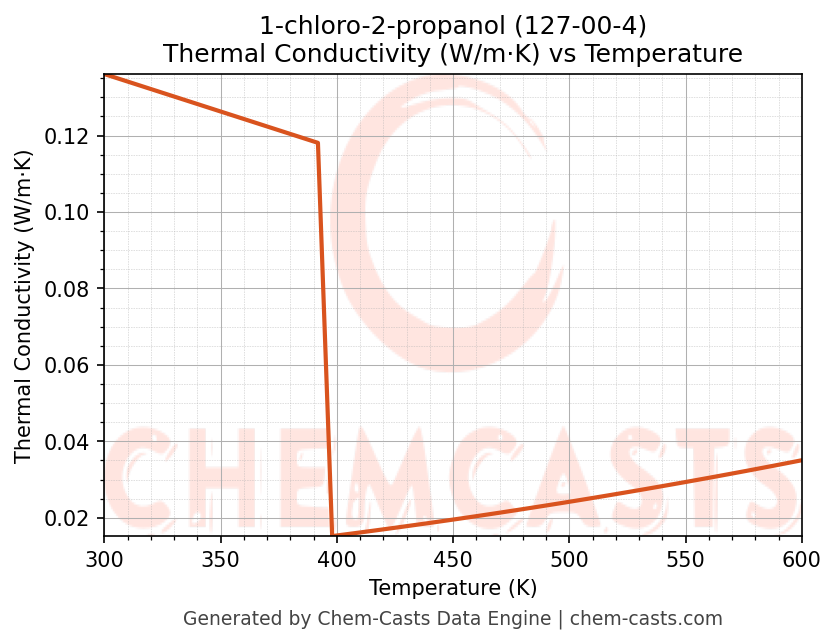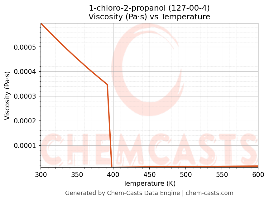This page presents the temperature-dependent thermodynamic and transport properties of 1-chloro-2-propanol (CAS 127-00-4) calculated at a constant pressure of 1 atm (101325 Pa) over the temperature range 250-500 K.