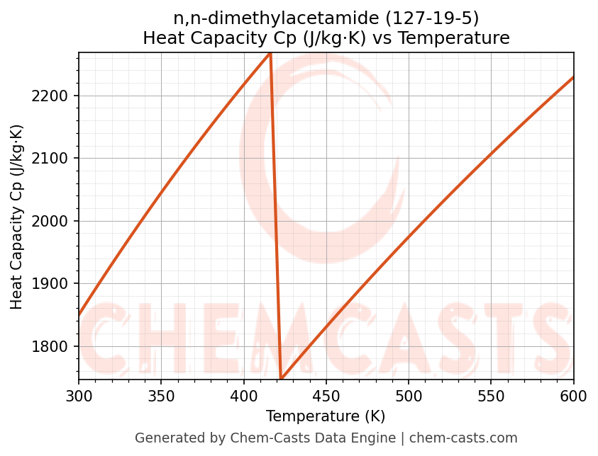 - Specific heat capacity (Cp) indicates the amount of energy required to raise the temperature of n,n-dimethylacetamide and is critical for energy balance and heat-exchanger design.