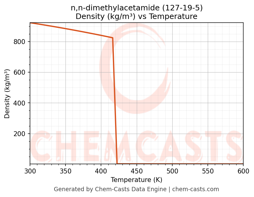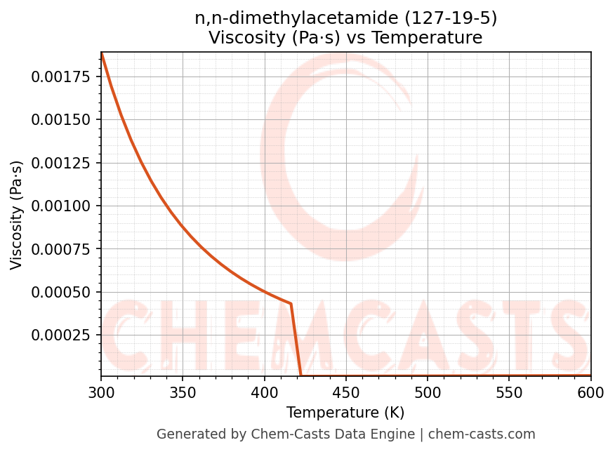 This page presents the temperature-dependent thermodynamic and transport properties of n,n-dimethylacetamide (CAS 127-19-5) calculated at a constant pressure of 1 atm (101325 Pa) over the temperature range 250-500 K.