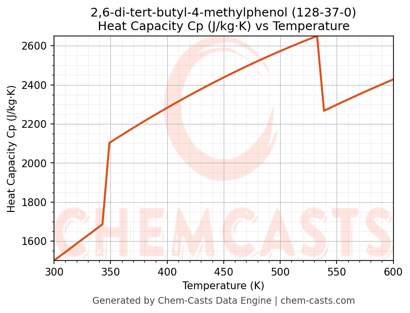 - Specific heat capacity (Cp) indicates the amount of energy required to raise the temperature of 2,6-di-tert-butyl-4-methylphenol and is critical for energy balance and heat-exchanger design.