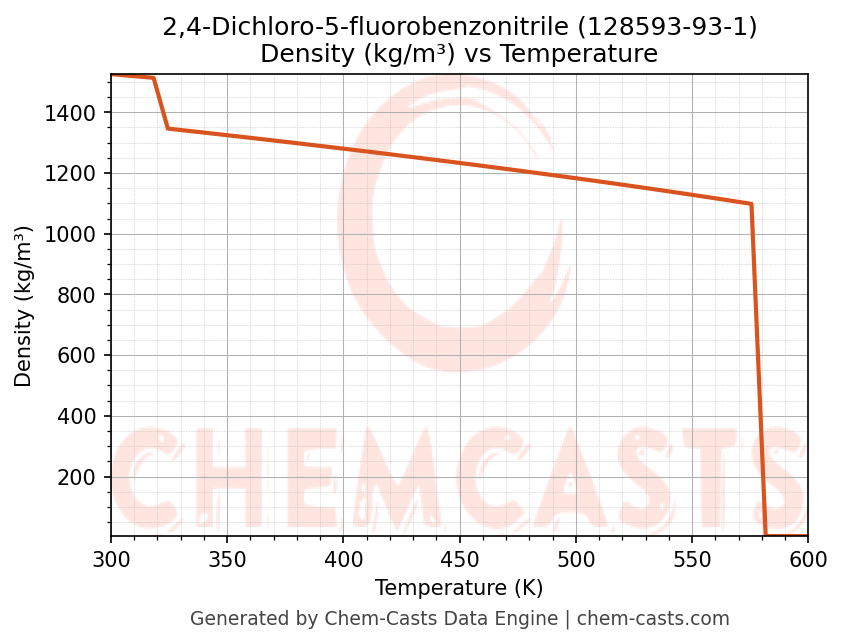 This page presents the temperature-dependent thermodynamic and transport properties of 2,4-Dichloro-5-fluorobenzonitrile (CAS 128593-93-1) calculated at a constant pressure of 1 atm (101325 Pa) over the temperature range 250-500 K.