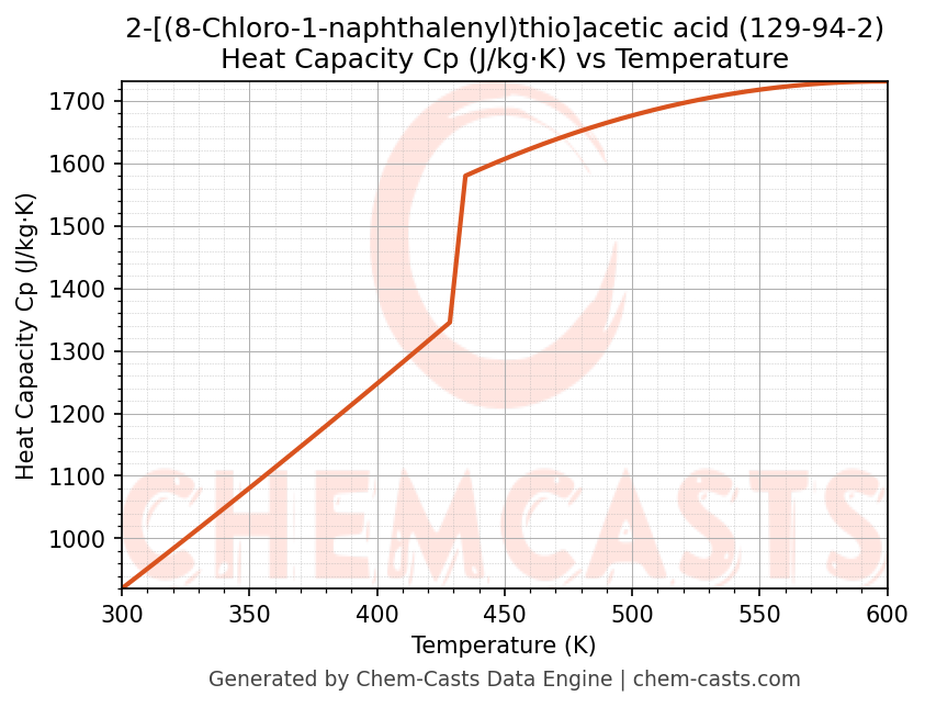 ![Heat Capacity (Cp) vs Temperature chart for 2-[(8-Chloro-1-naphthalenyl)thio]acetic acid (CAS 129-94-2)](https://chemcasts-prod.s3.ap-south-1.amazonaws.com/chem_plots_pconst/129-94-2-cp.png)