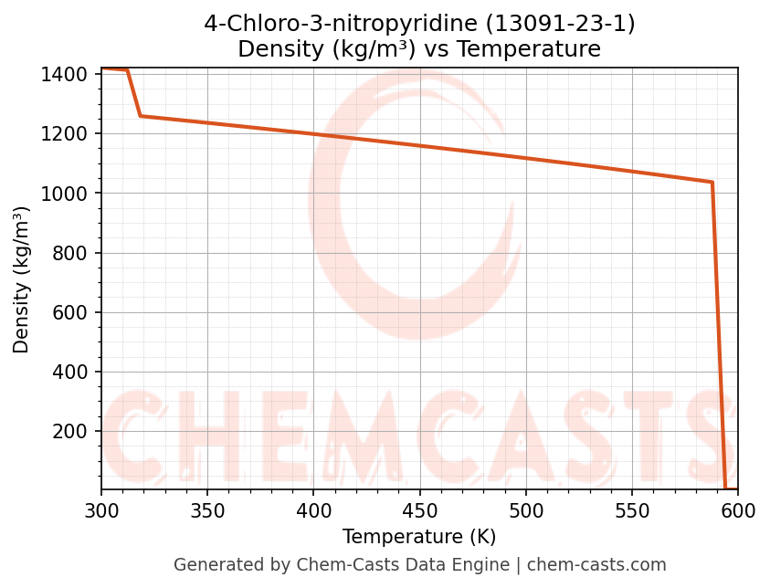 This page presents the temperature-dependent thermodynamic and transport properties of 4-Chloro-3-nitropyridine (CAS 13091-23-1) calculated at a constant pressure of 1 atm (101325 Pa) over the temperature range 250-500 K.