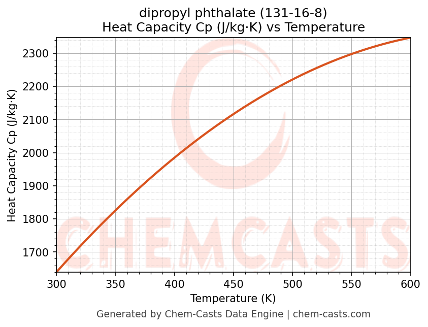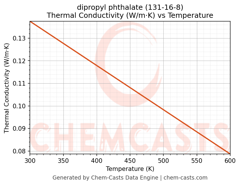 This page presents the temperature-dependent thermodynamic and transport properties of dipropyl phthalate (CAS 131-16-8) calculated at a constant pressure of 1 atm (101325 Pa) over the temperature range 250-500 K.